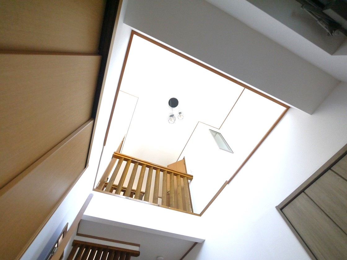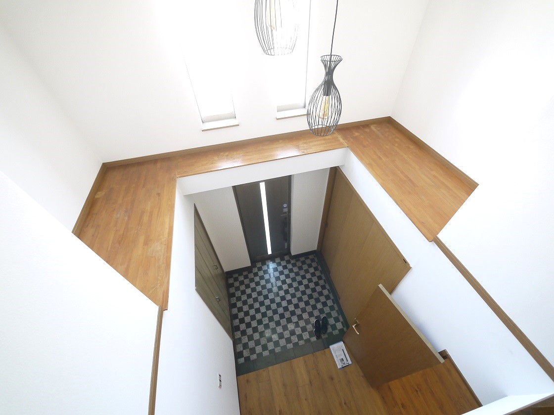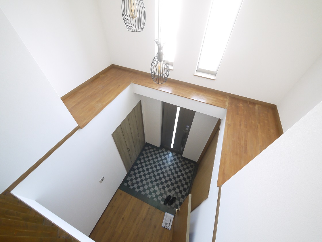 吹抜けのある玄関はゆとりある空間で明るい陽射しが差込みます